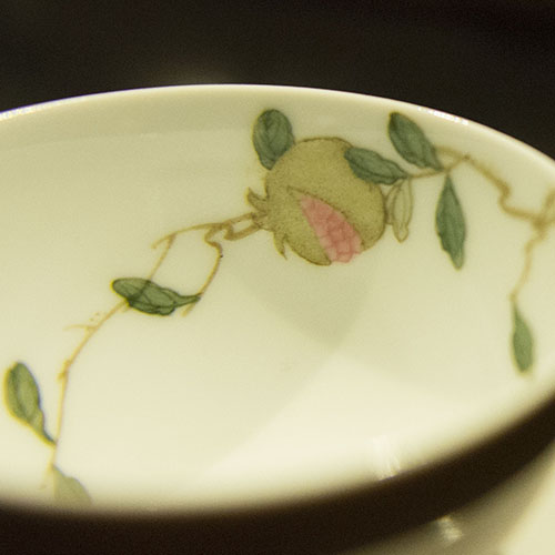 石榴杯的整个制瓷过程,从制坯、烧成、彩绘、二次烧成,环环相连,一丝不苟。这盏石榴杯,华贵深凝,工艺的精致细腻,使其透出高雅的格调。另外,石榴的图案表露出自然精神,耐人寻味。石榴代表的含义是多子多福,美满幸福。